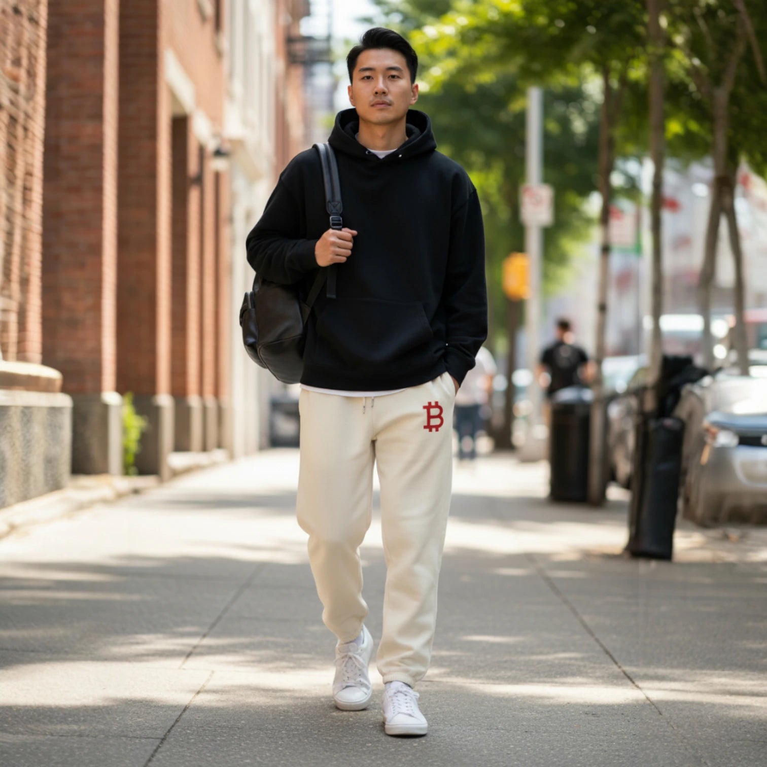Generated image of female model with corrected facial features wearing white "je ne sais quoi de bitcoin" hoodie with matching wide-leg pants